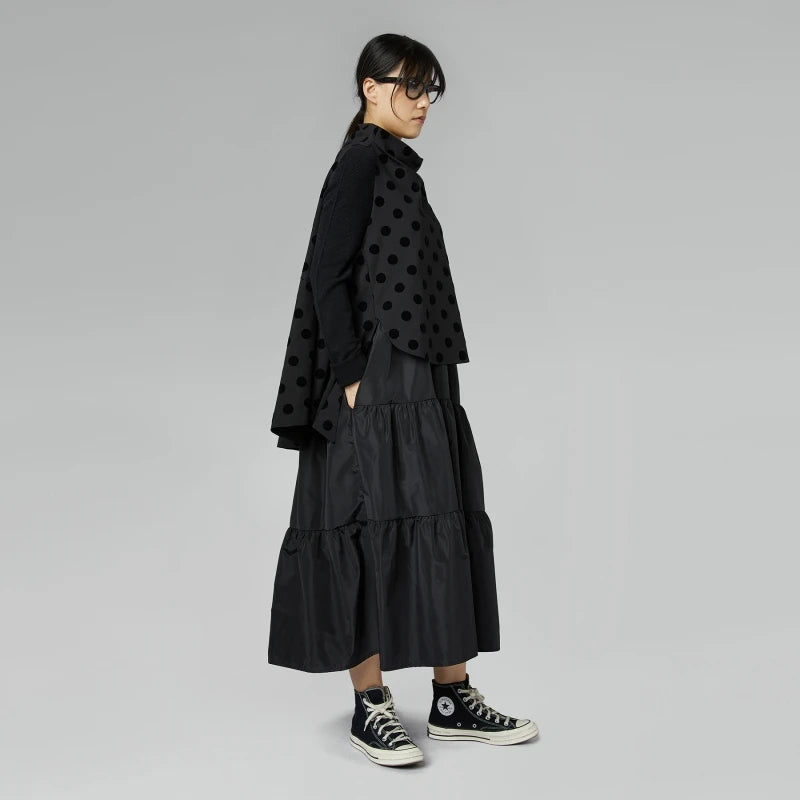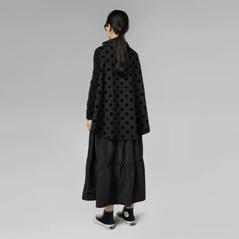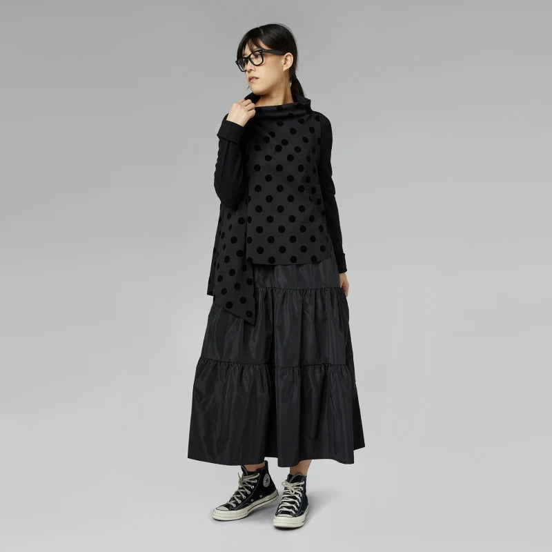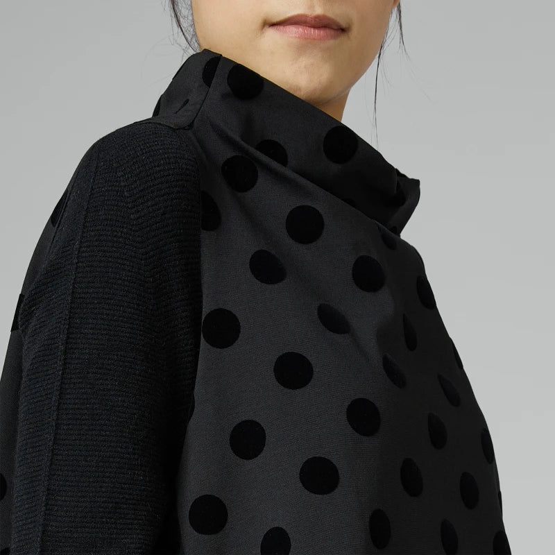 Chic black top with soft velvet polka dots for a playful yet elegant touch . Its straight cut and 3/4 sleeves make it a versatile piece for layering or wearing on its own. Ideal for everyday chic looks - style with jeans for casual outings or tuck into a skirt or tailored pants for polished office or dinner outfit
