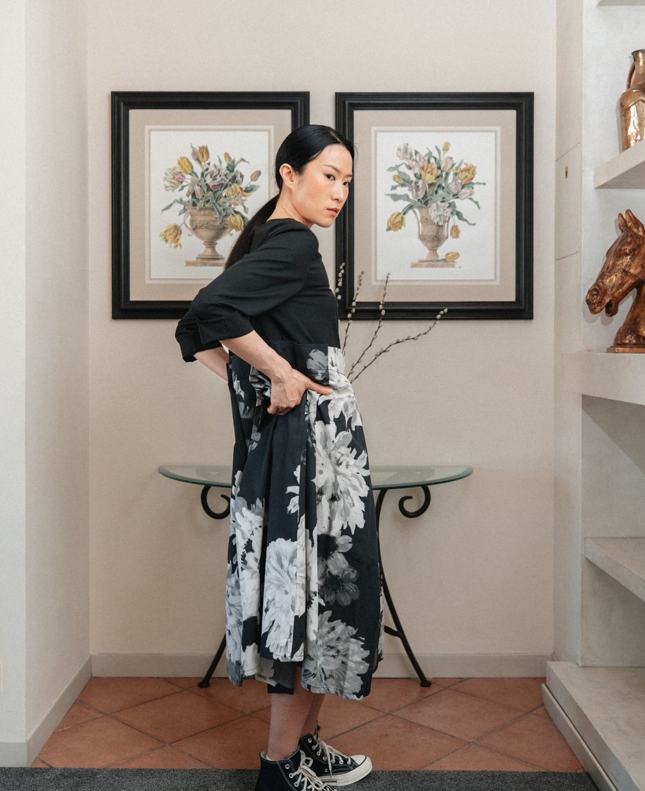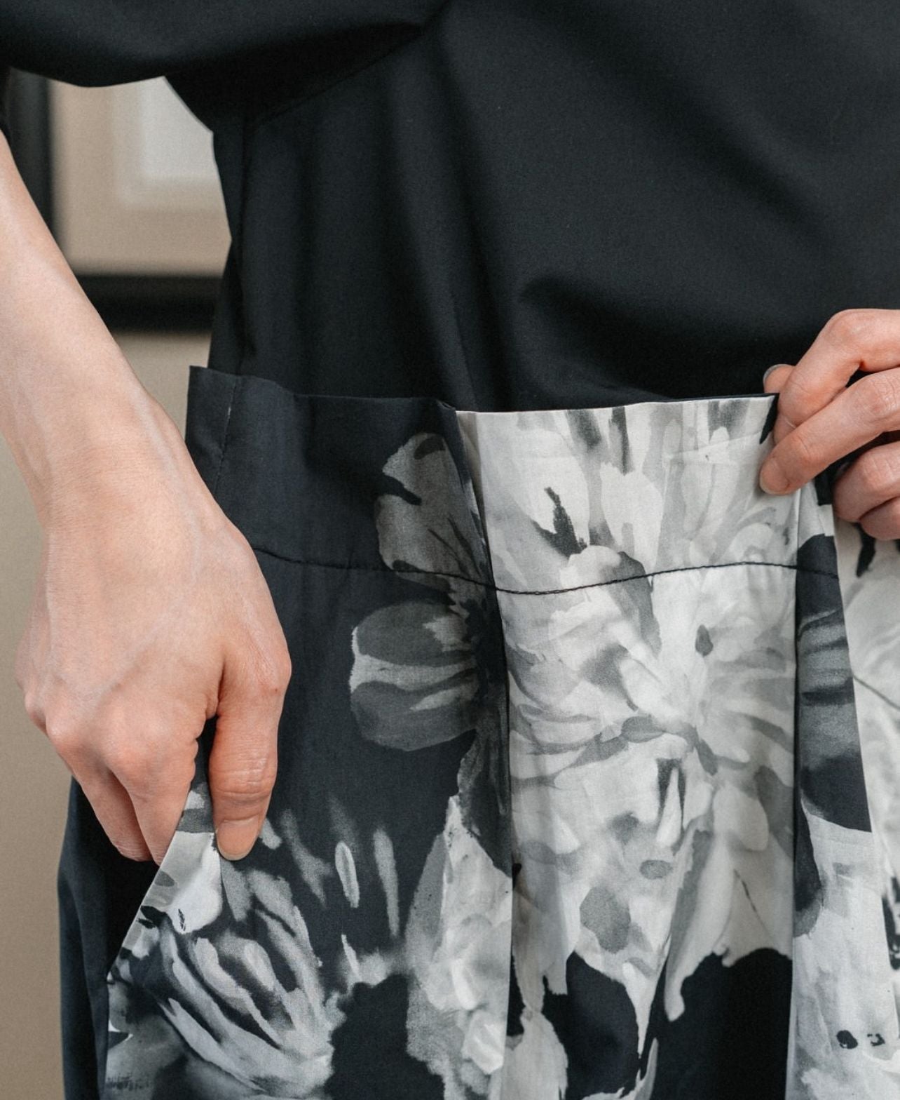 Embrace sophisticated style with this striking long-sleeved dress designed to make an effortless statement. The top half features a simple, universally flattering black bodice with classic round neck , offering a sleek and comfortable fit. Below the waist , the dress transitions into a voluminous, asymmetrical . A-line skirt showcasing a dramatic monochromatic floral print in shades of black , charcoal and ivory. This gorgeous design creates the impactful look of a fitted top paired with a flowing , artistic skirt , making it a perfect , versatile choice for elevated everyday wear , office settings or evening engagements.
