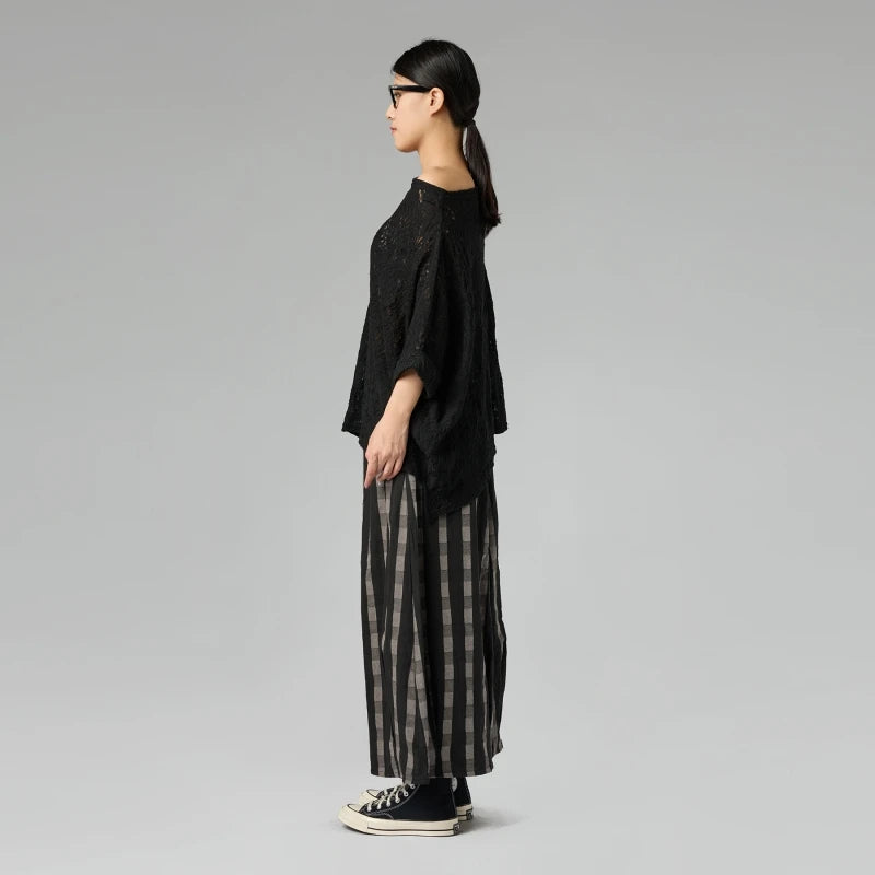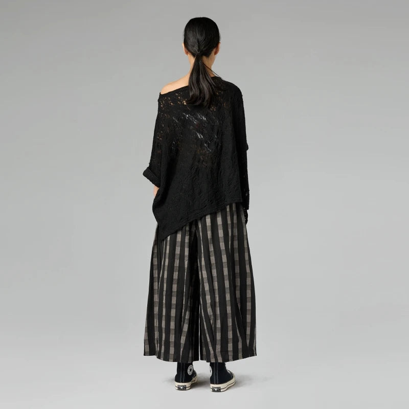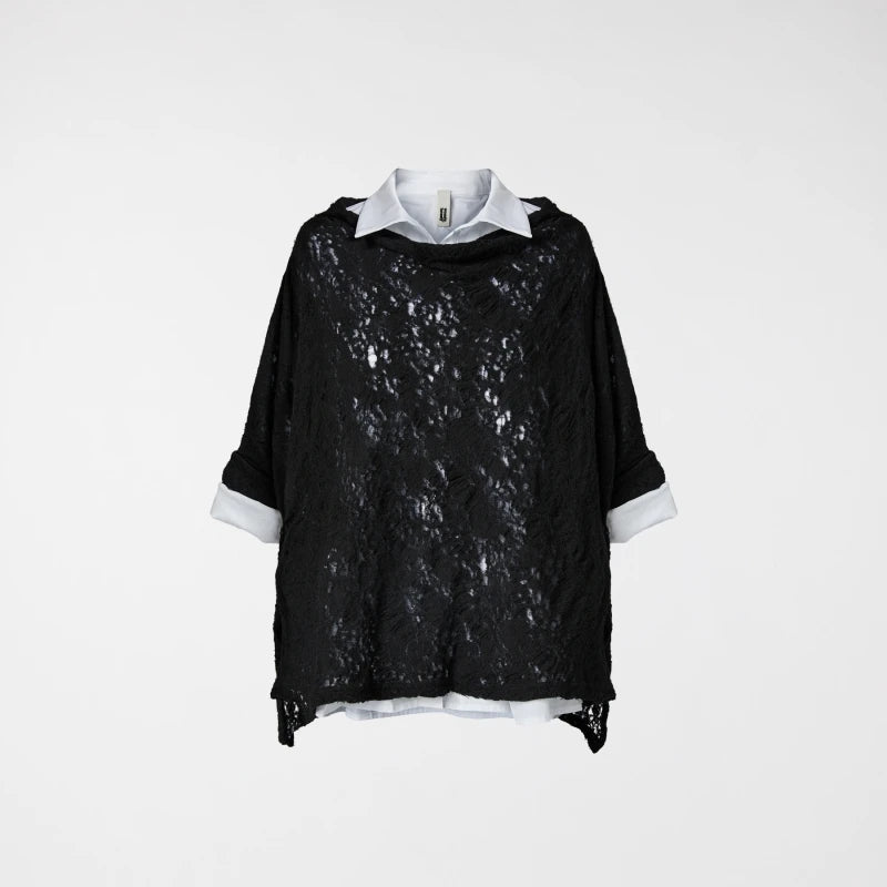 Elevate any look with this beautifully textured black knit top . Designed with a flowing oversized silhouette it offers comfort without sacrificing style .The intricate sheer, lace-like pattern adds a touch of bohemian elegance and allows for creative layering.