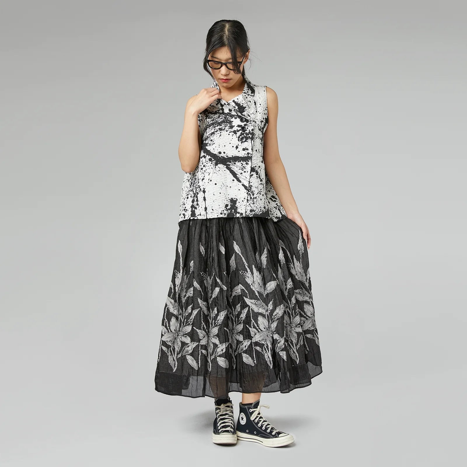 Vest in cotton fabric with ink pattern. Round high neckline. Closure with buttons, patch pockets, flared line and comfortable fit.