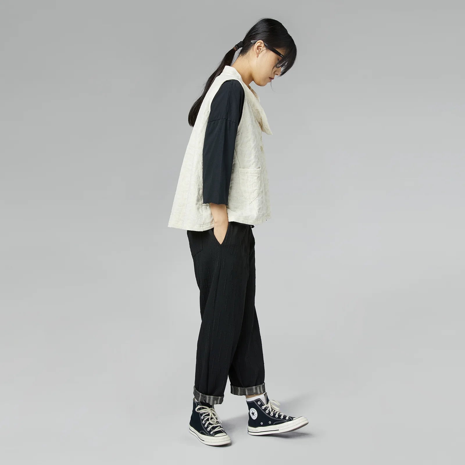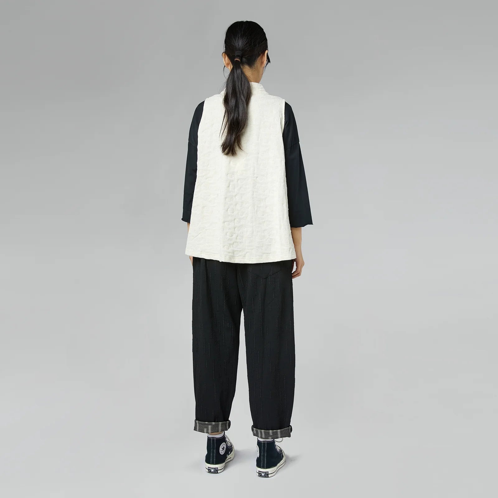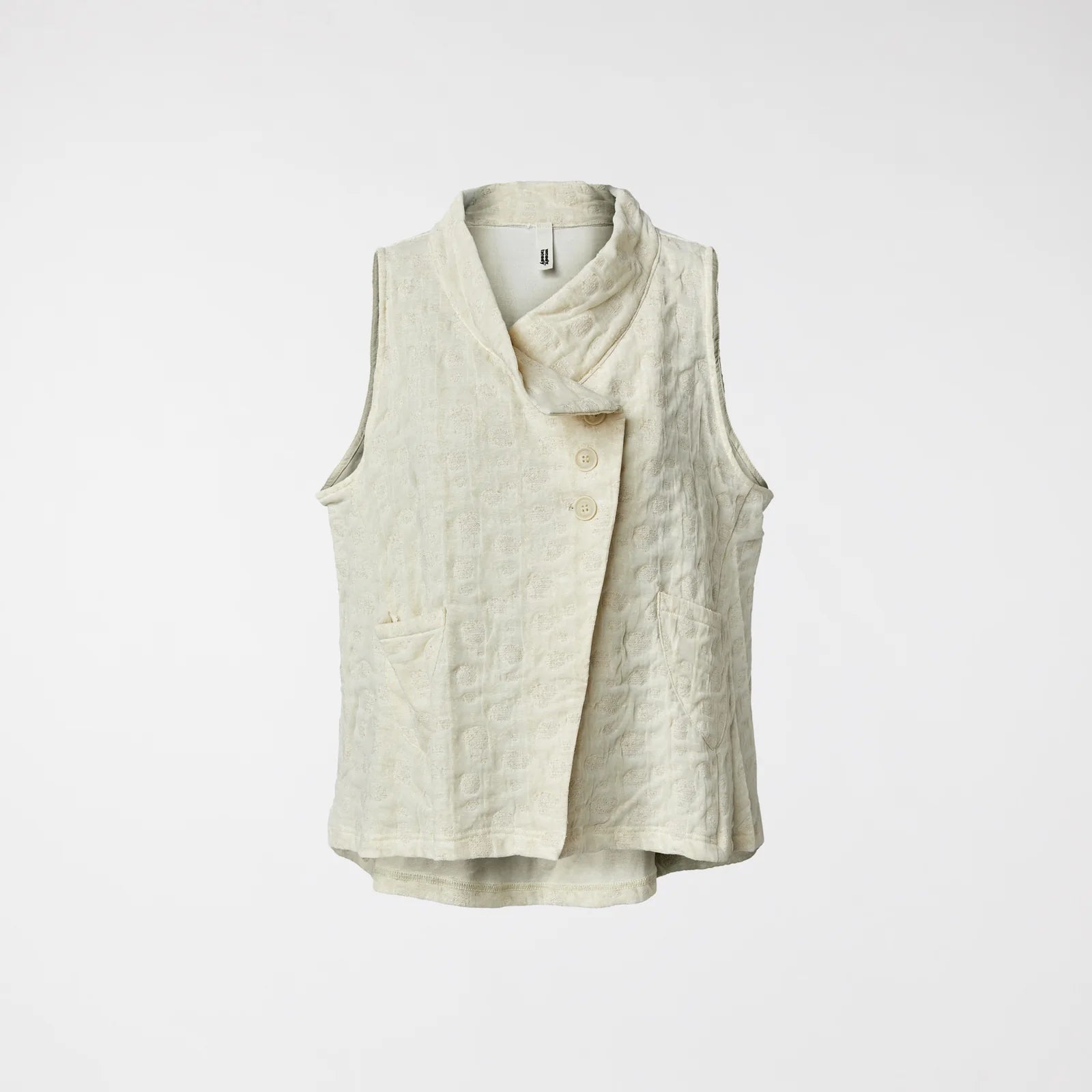 Polka dot embossed effect fabric vest with gold yarns. Front buttons closure, soft hight collar unmannered. Front pockets applied , soft hand, comfortable fit.