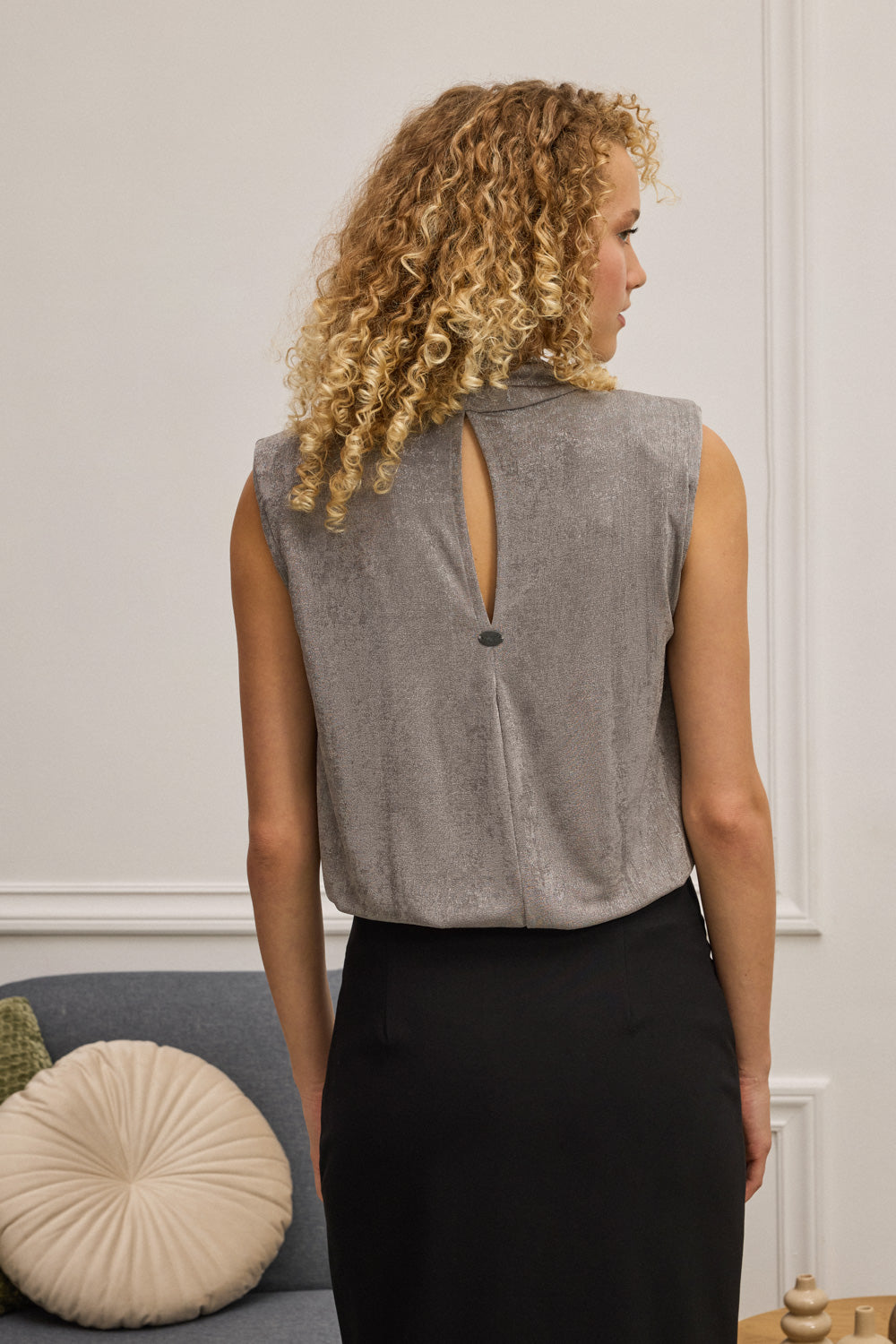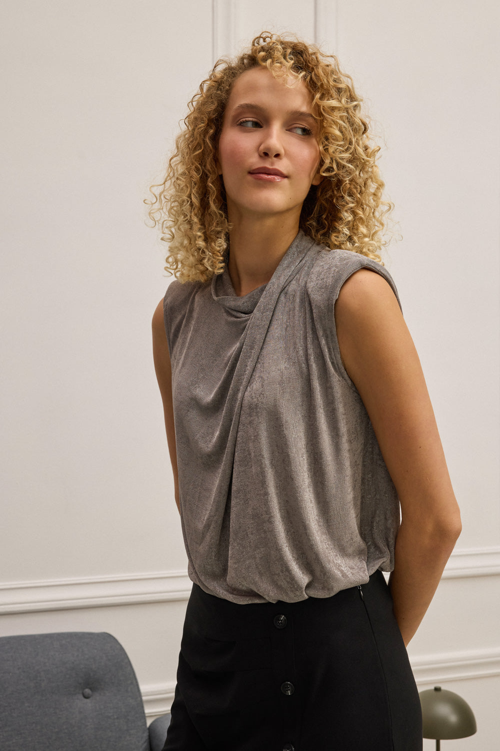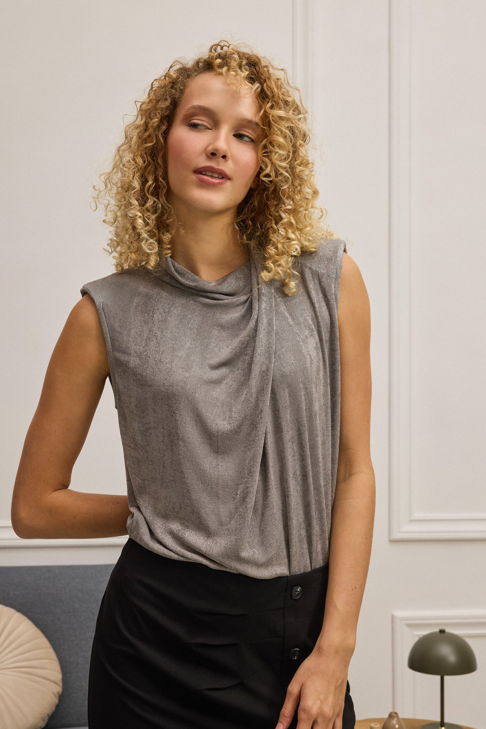 Make a contemporary statement with this striking loose-fit blouse featuring a bold, asymmetrical geometric print. The eye-catching pattern consists of white, interlocked lines creating a fragmented, abstract design across a dark grey or black background. Designed with a wide neckline that can be worn off-the-shoulder or as a relaxed boat neck, the top features oversized, flowing sleeves that contribute to its comfortable and dramatic drape. The asymmetrical hemline adds a modern edge, making this top perfect for pairing with slim-fit trousers or skirts to balance the volume and showcase the unique graphic print.