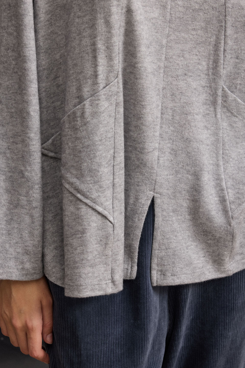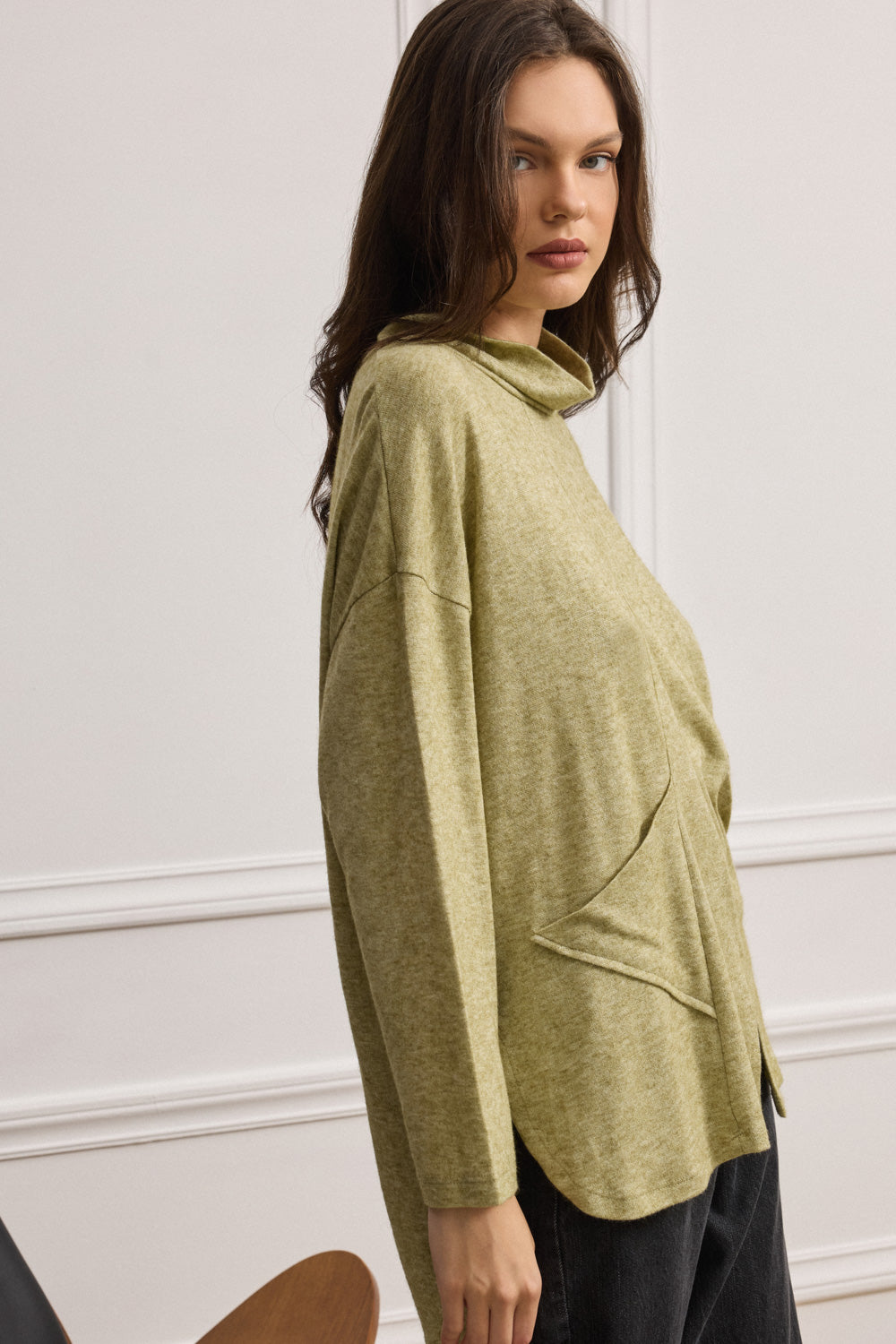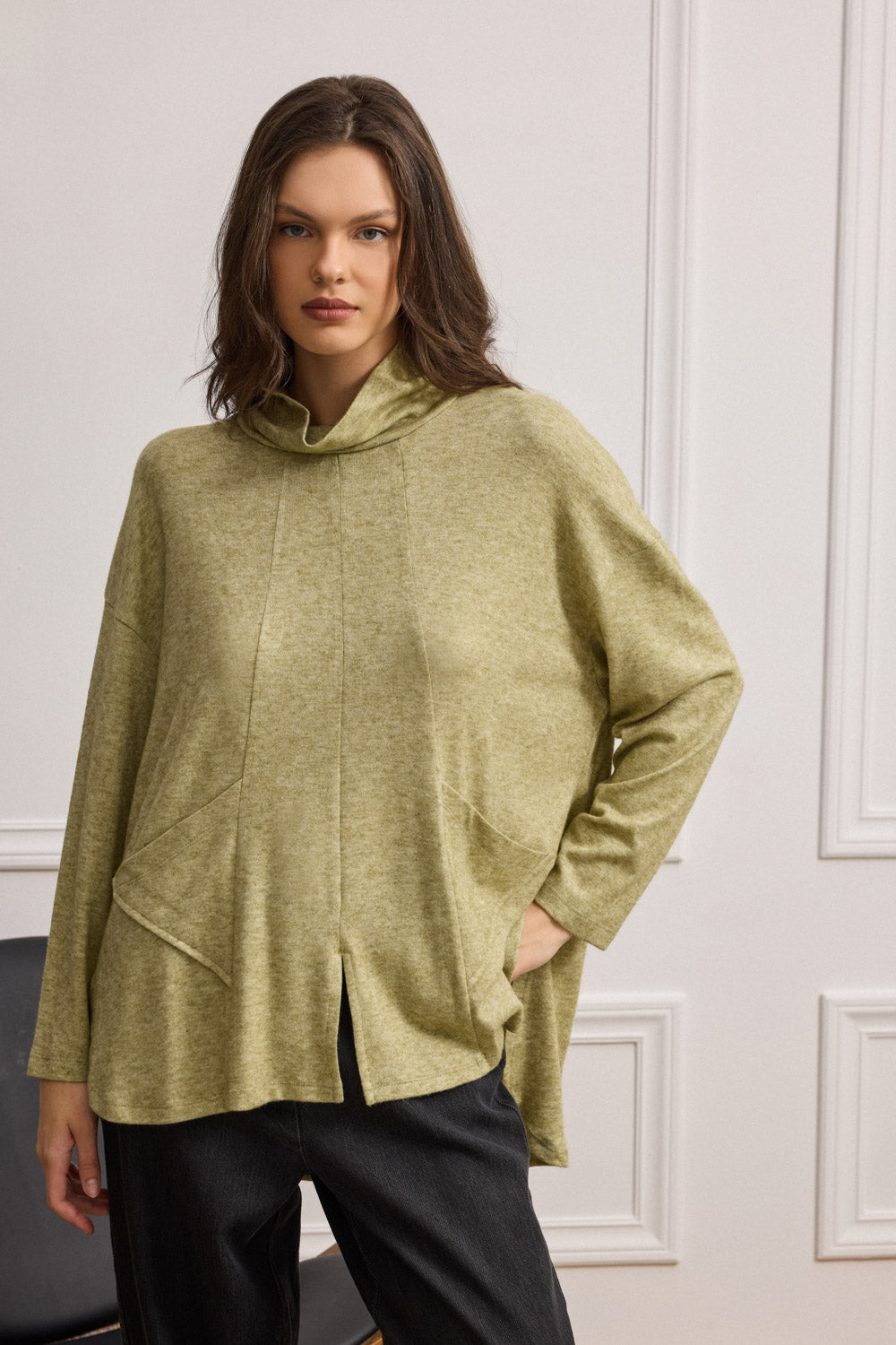 Embrace effortless comfort with this cosy and chic long-sleeved tunic sweater, available in versatile Grey and classic Black. Crafted from a soft, relaxed knit fabric, this piece features a stylish cowl or funnel neckline for a relaxed yet elegant look, and a longer, tunic length that provides flattering coverage. Design details include subtle vertical seam lines on the front, two functional patch pockets near the hem, and side vents to enhance movement and the modern, high-low silhouette. Its easy, oversized fit makes it perfect for pairing with leggings, slim-fit trousers, or the matching printed pants for a comfortable and polished everyday ensemble.
