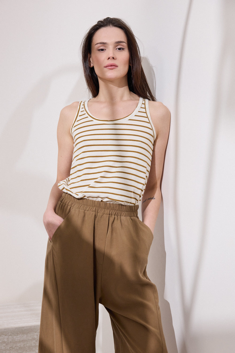 Sleeveless t-shirt made from 100% cotton, with a soft texture that offers comfort all day long. It features an open neckline and striped pattern, giving a casual but at the same time stylish character to the outfit.