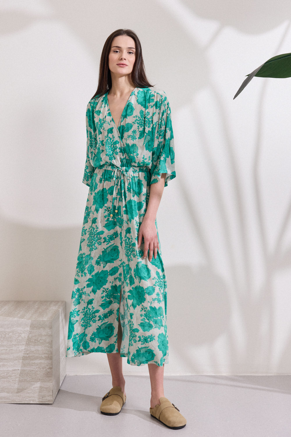 Long dress made from viscose with a two-tone floral print , in a comfortable fit. The top is a vapored and features ruffles on the shoulders with puff sleeves. The waist is emphasized with an elastic band and a tunnel through witch a cord passes, decorated with wooden beads for adjustable fit. It is completed with an opening in the central front highlights its line.