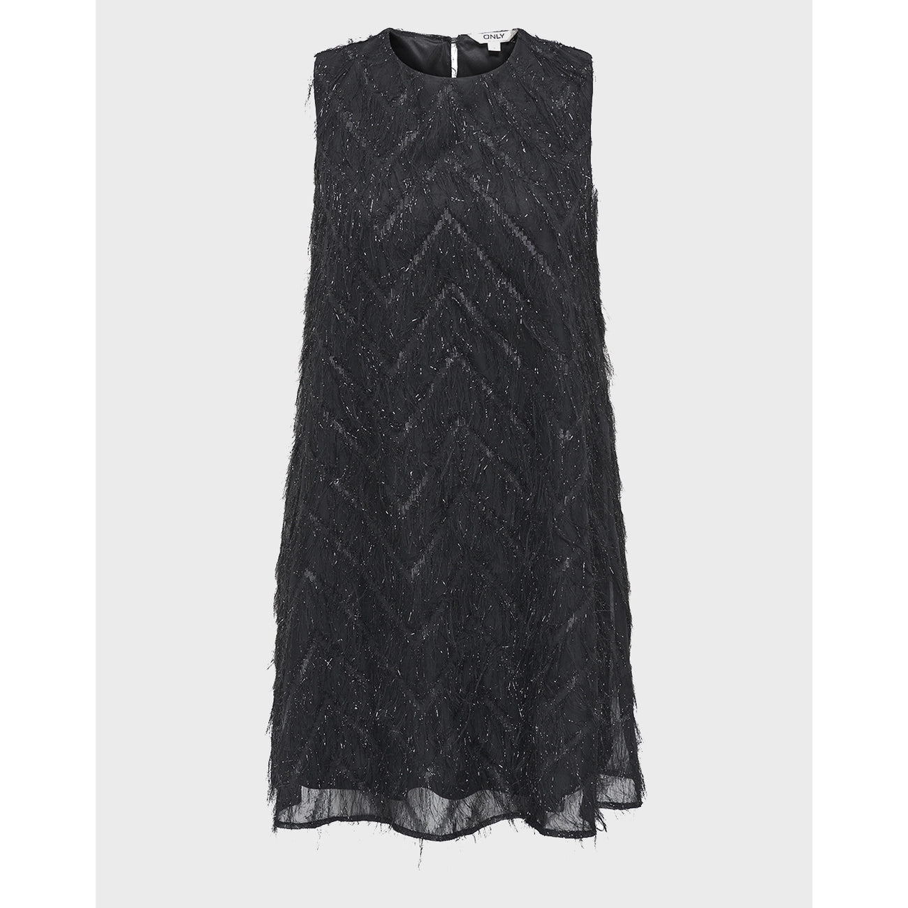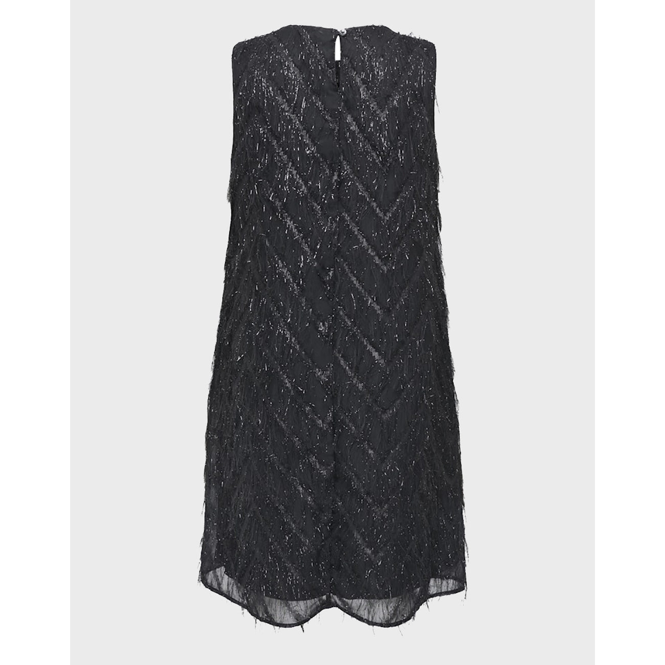 Make a statement with this glamorous black feather-textured sleeveless dress a perfect blend of elegance and modern flair. Designed with a soft shimmery overlay featuring feather - like details , this dress catches the light beautifully for a subtle eye-catching sparkle .The A-line silhouette offers a comfortable and flattering fit while the sleeveless cut makes it ideal for evening occasions and festive events
