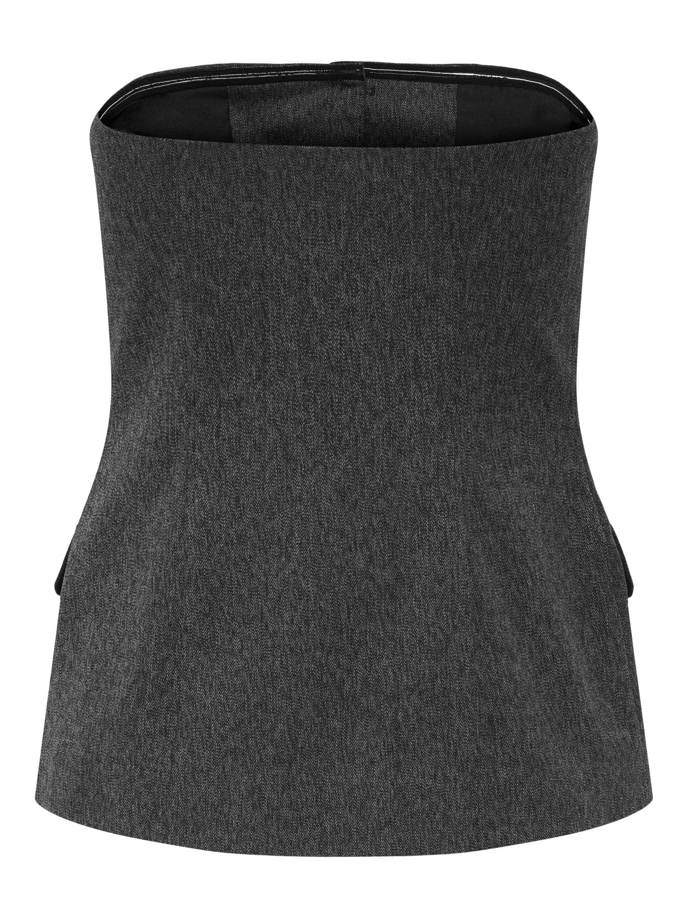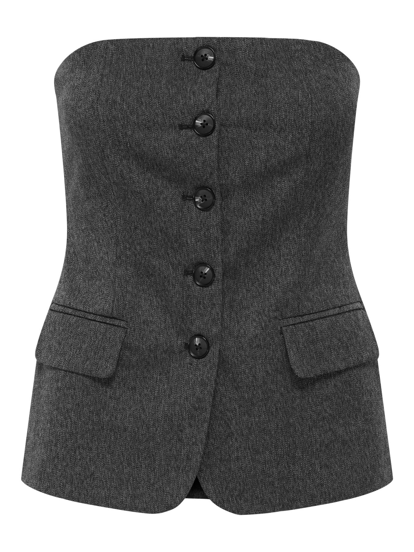 A sophisticated strapless waistcoat created in a structured suiting fabric. The design features a straight tube-style neckline that sits firmly across the bust , a central button closure with five statements buttons and tailored princes seams for a contoured fit. Two front flaps pockets add a traditional menswear inspired touch, while the cropped length and clean finish modernize the look. This versatile piece can be worn as a statement top or layered over blouses for a chic tailored edge.