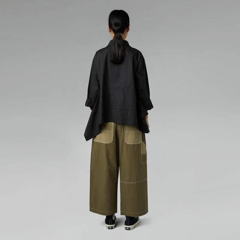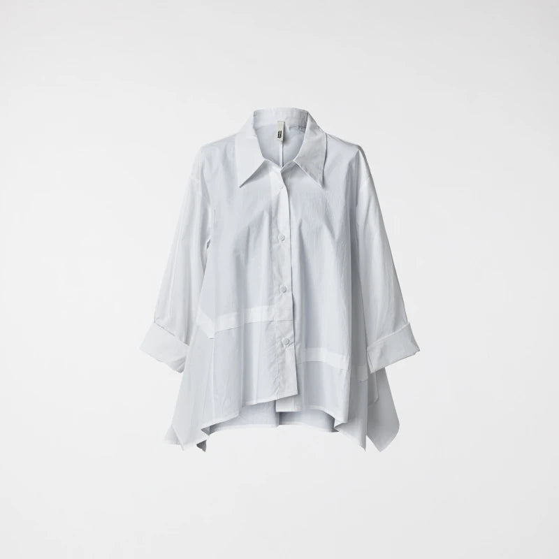 Modern asymmetrical shirt with a crisp collar and flowing hemline. The oversized cut and unique drape add a contemporary twist to a timeless wardrobe staple making it versatile and statement-worthy . Perfect for smart-casual looks- pair with tailored trousers or skirts for work or style with jeans and boots for an elevated everyday outfit. Great for layering under structured jackets for a chic finish