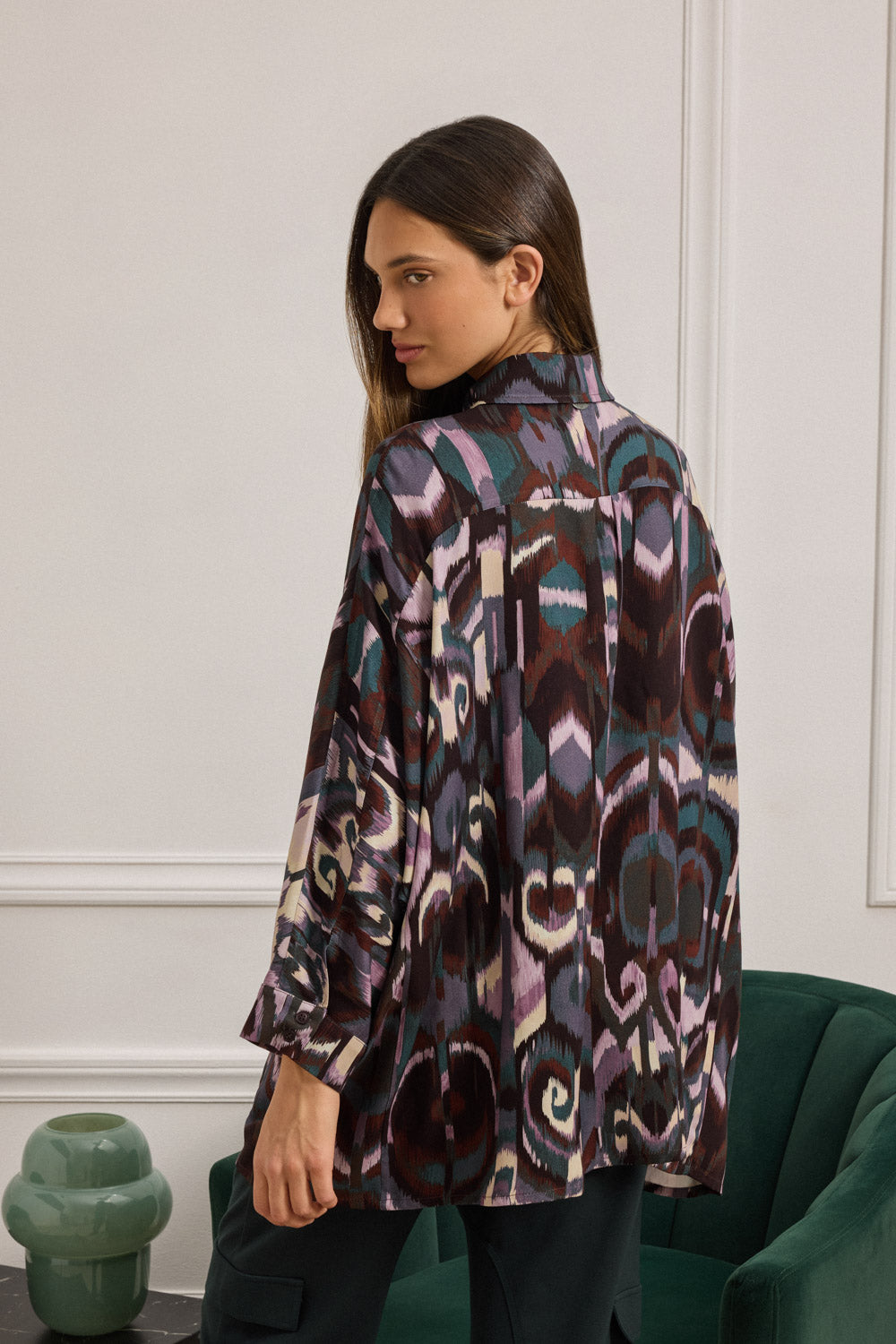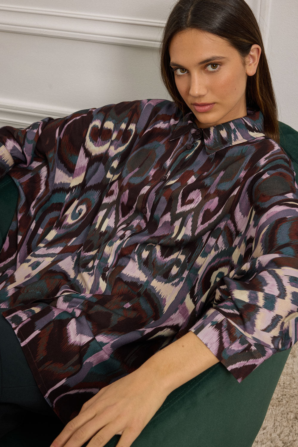 Elevate your style with this eye-catching button-down shirt . It features a flowing silhouette and a captivating Ikat-inspired pattern in a rich , harmonious mix of deep purples, charcoal grey and earthy brown tones . Comfortable yet distinctive , this shirt is a perfect statement piece , blending a classic cut with a vibrant , globally- inspired print for a look that's effortlessly chic.