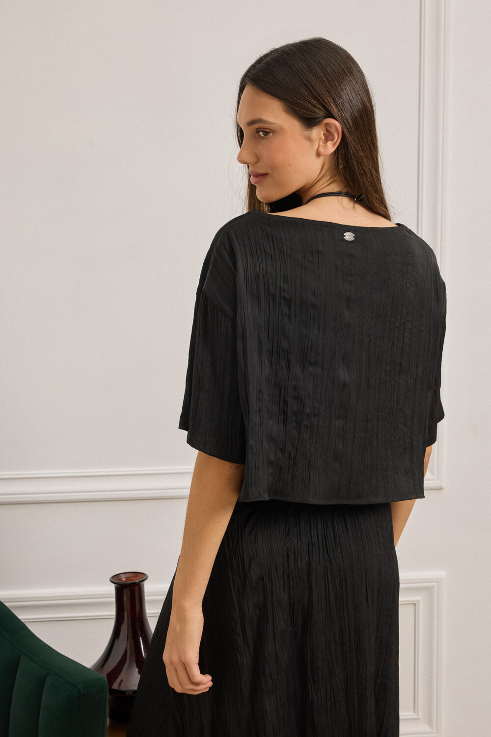 Introduce sustainable luxury to your wardrobe with this Textured Short-Sleeve Top, crafted from Recycled Polyester material. This elegant piece boasts a rich, dark hue and a distinctive finely ribbed or plissé texture, which adds beautiful vertical dimension and movement to the fabric. Designed with a classic crew neck and a slightly relaxed, short-sleeve silhouette, this top offers a sophisticated drape and effortless wearability. It's an essential, conscious choice for pairing with structured trousers or adding a textural contrast under a tailored blazer.