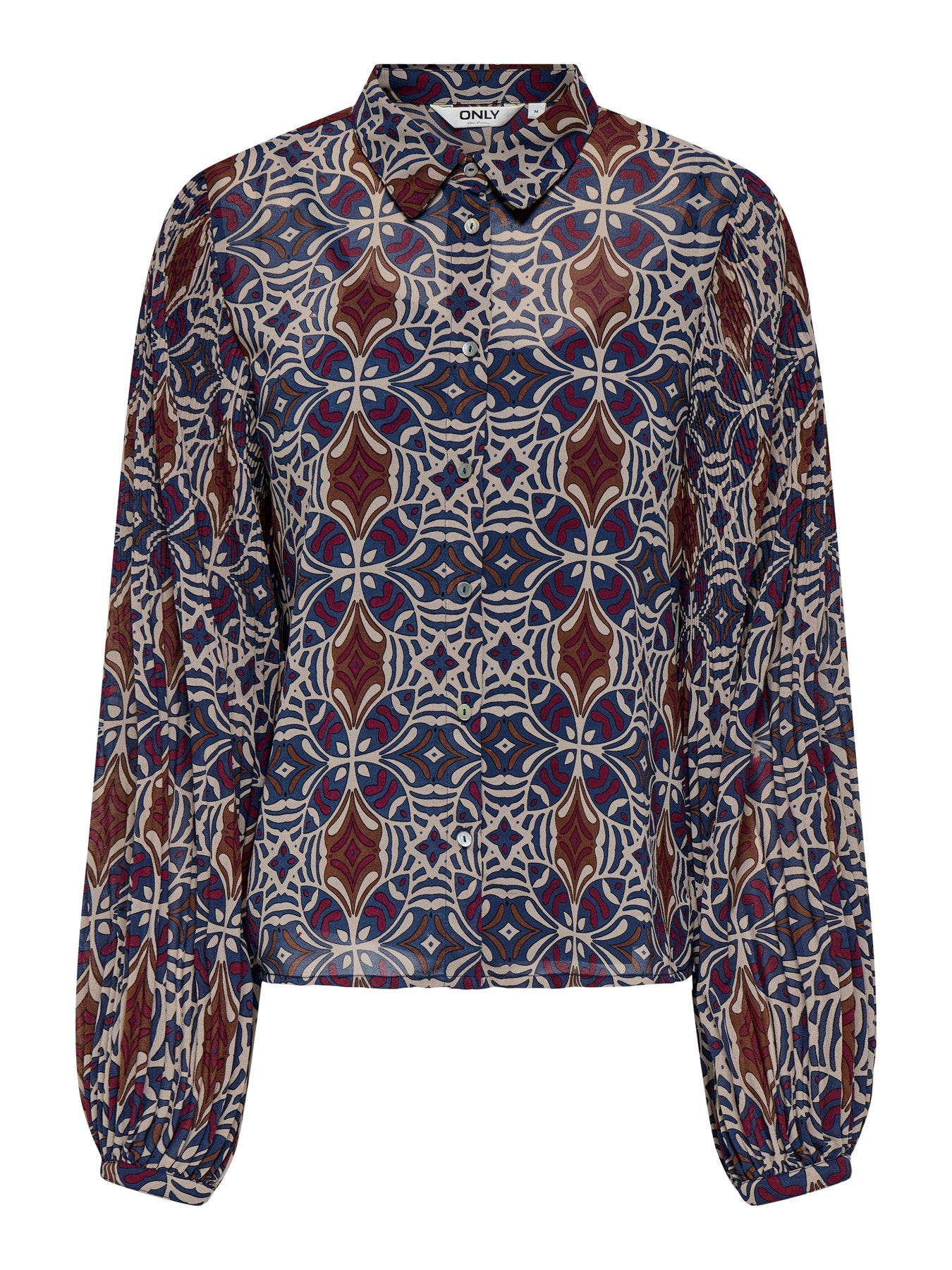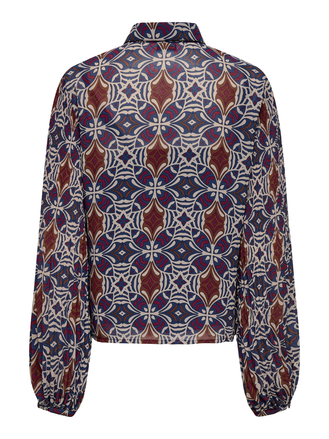 Vibrant blouse with an eye-catching geometric print in rich tones of blue burgundy and cream . Designed with classic collar button-down front and pleated long sleeves it adds both elegance and personality to your look . Perfect for office wear, dinners or styled casually with denim.