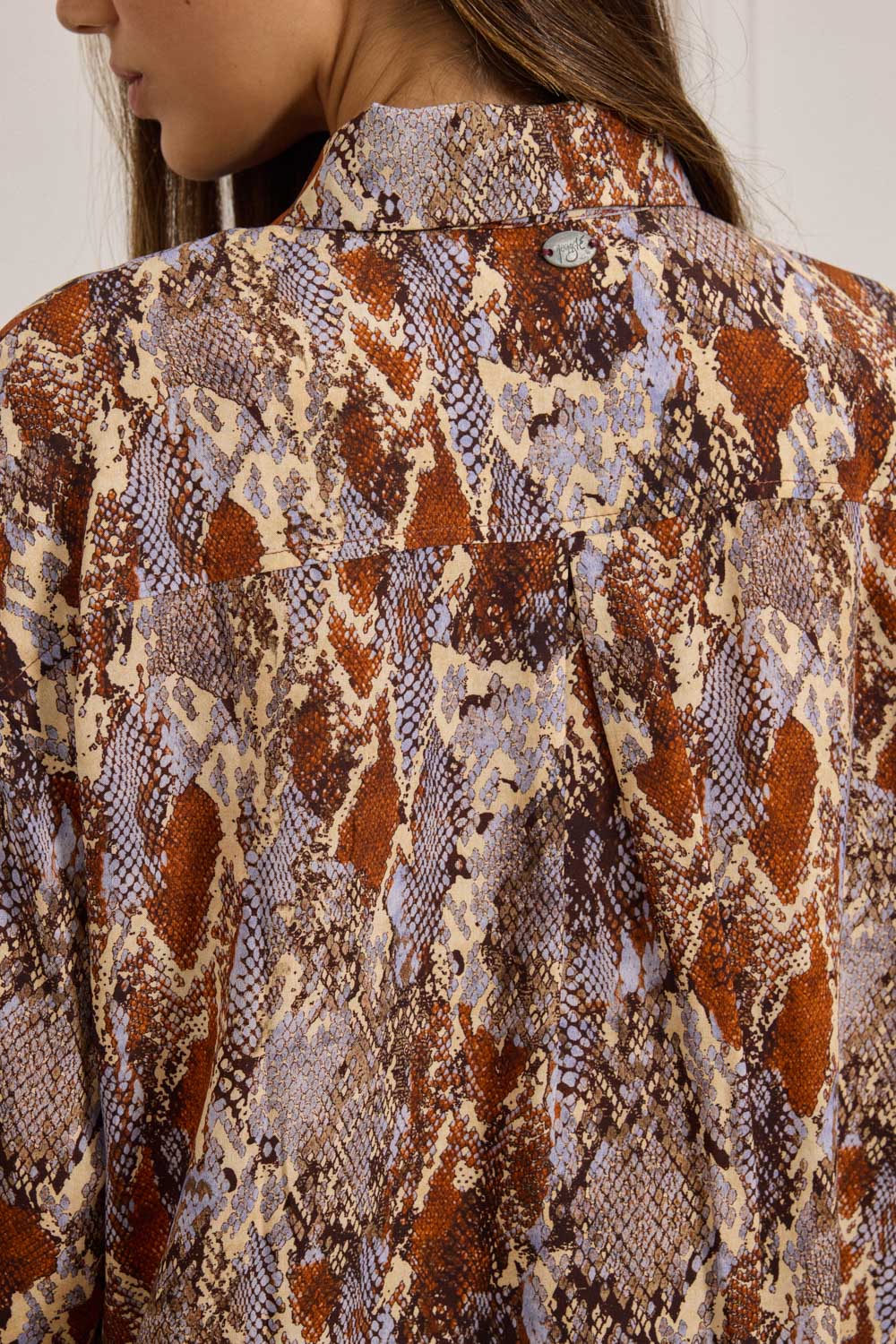 Embrace your wild side with this striking snakeskin print blouse. Featuring a mesmerizing all-over pattern in rich shades of brown ,rust, beige and soft lilac, this top is a true statement piece. The classic button-up design and collared neckline offer timeless sophistication while the bold silky-feel fabric ensures you stand out from the crowd. Perfect for pairing with tailored trousers for the office or black leather-look pants for night out.