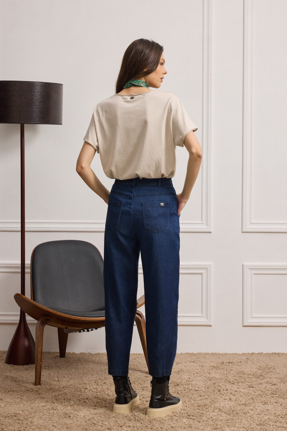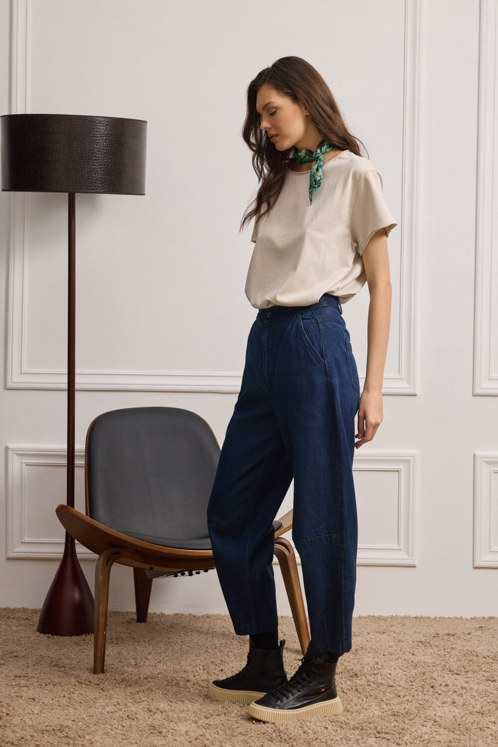 Relaxed-fit blue denim trousers with a slightly tapered leg , front pleats and practical side pockets .A modern take on classic jeans , offering comfort with a polished finish. Perfect for everyday wear-pair with a simple tee for casual looks or dress them up with tailored jacket or knit for smart-casual occasions.
