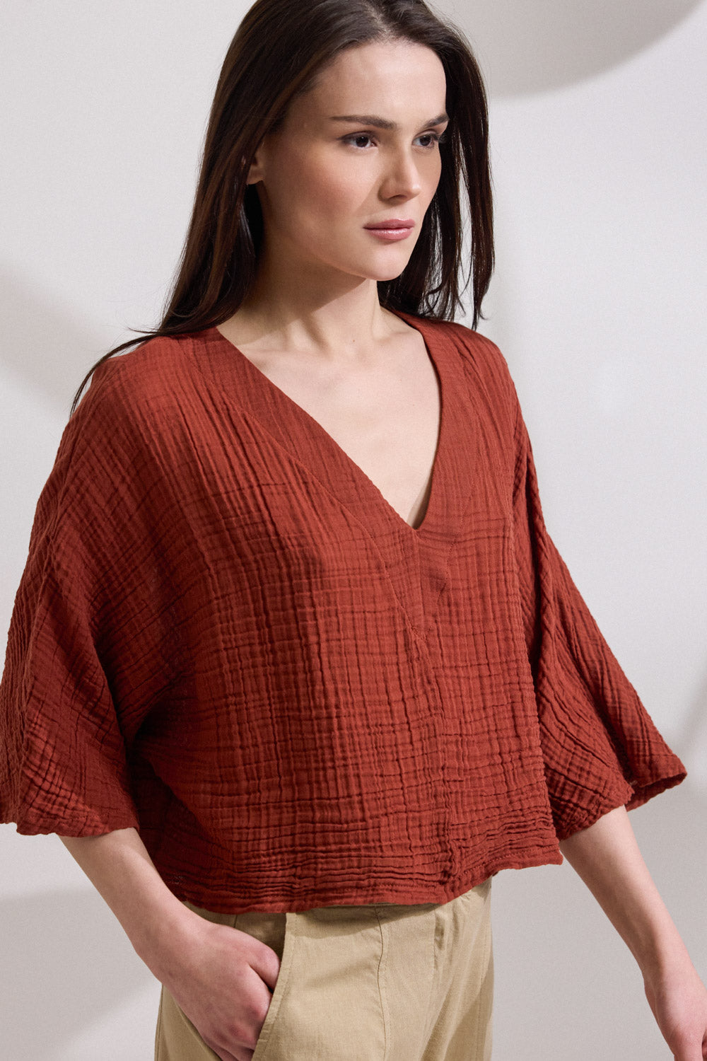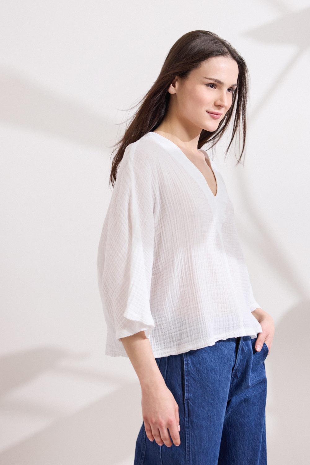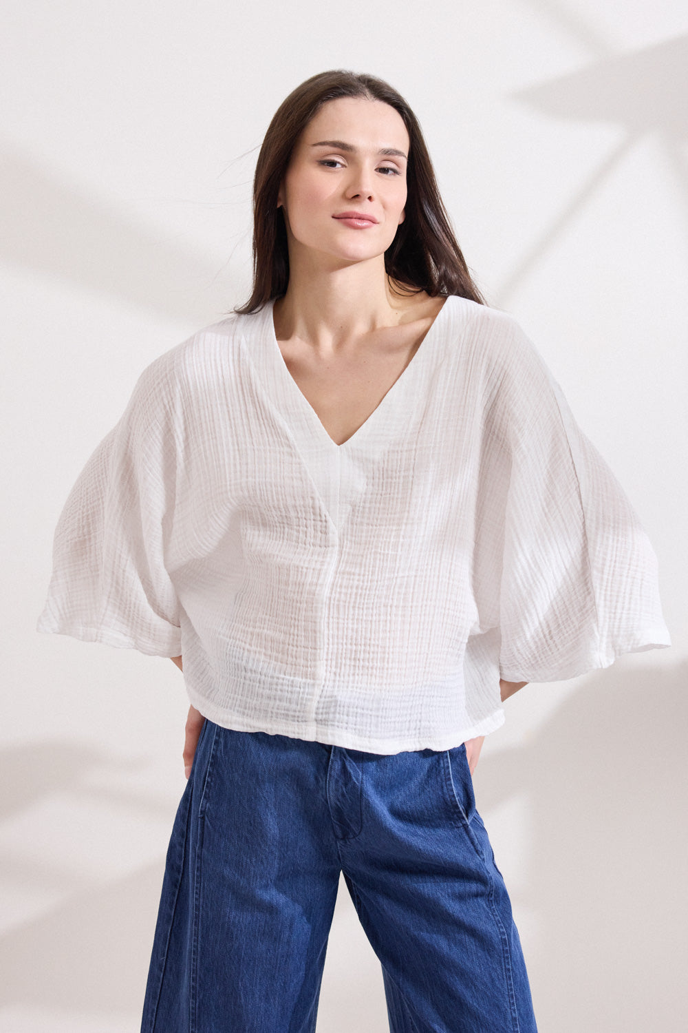Tunic made of cotton crinkle fabric with v-neckline and puff sleeves that naturally hug the body. The comfortable , relaxed line gives an unpretentious elegance while the texture of the crinkle fabric adds modern, light movement  to any look.